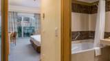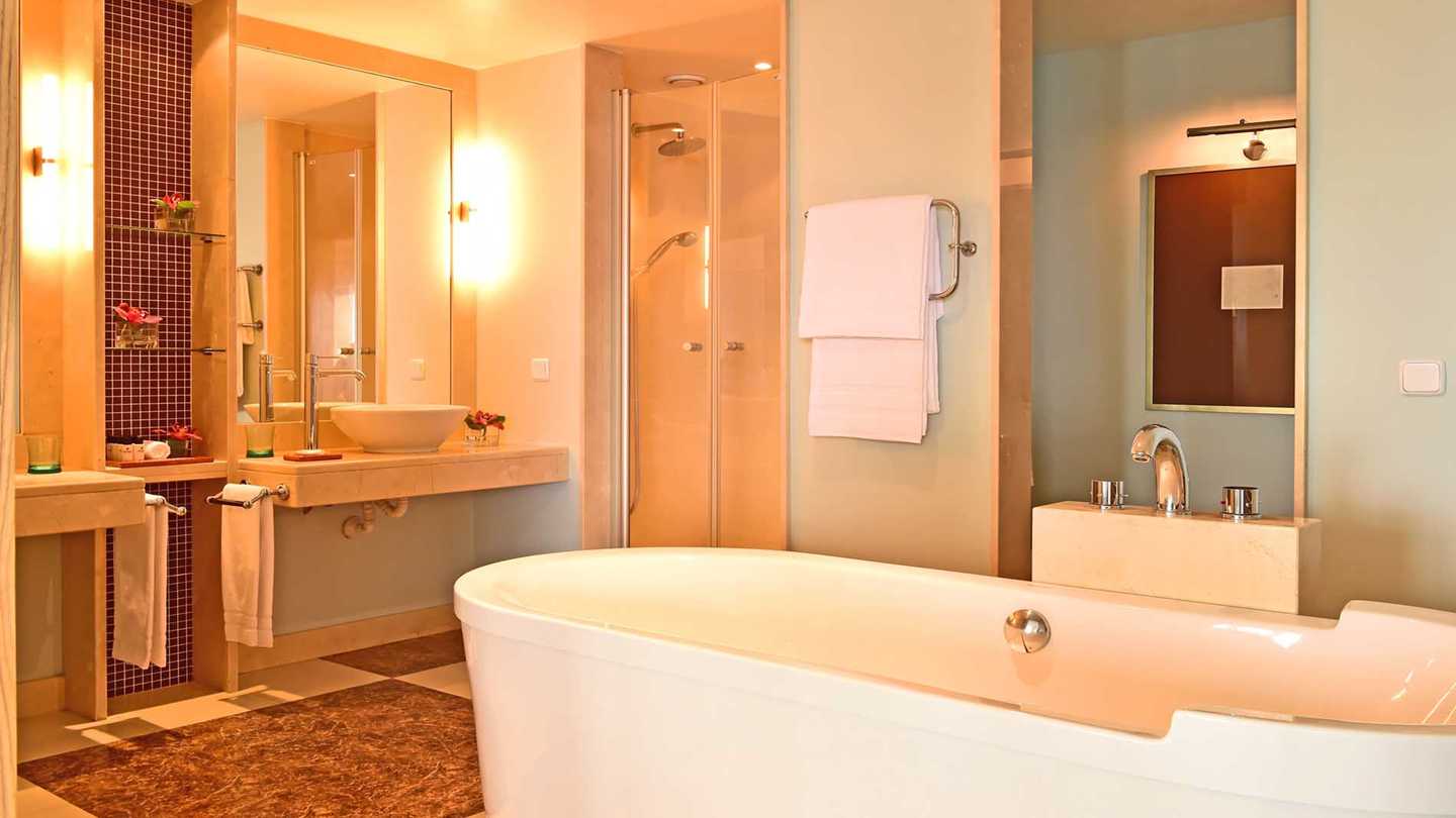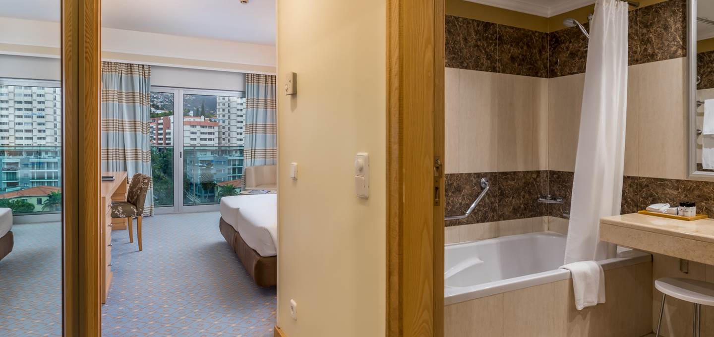 Suite with a living room featuring a sofa bed and a separate bedroom with carpeted floors and a king size bed. Some of the Suites have two bathrooms with bath, shower and hair dryer, as well as 2 balconies with a table, sun loungers and chairs with views of the ocean or the Bay of Funchal. Maximum capacity: 4 adults. Area: 70m²