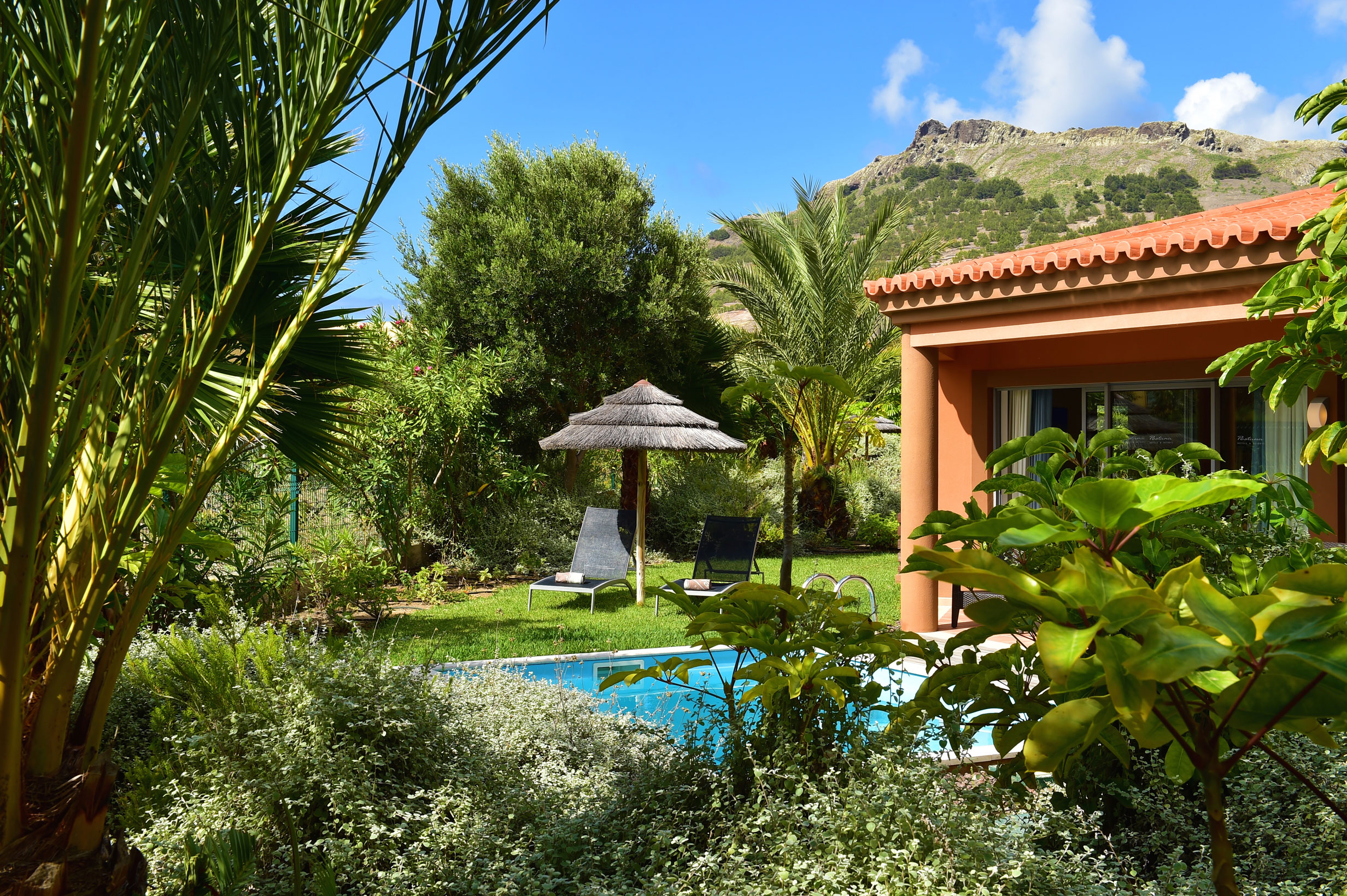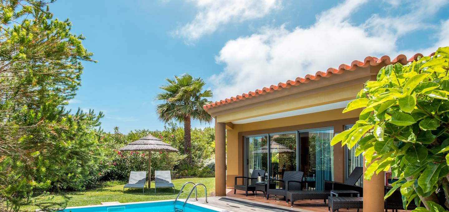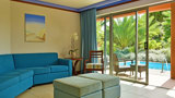 The Pool Villa is very spacious has two bedrooms, one with king bed and one with twin beds, accommodating up to four adults and two children. It has a separate living room with sofas, dining table and chairs for 4 people and two bathrooms. It also includes free digital safe and hairdryer. The Villa has at its disposal a private pool. Area: 54m²