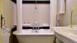 Room with a double bed and a balcony with inner courtyard views. Bathroom has a Victorian bath with a shower. Area: 49m². Max Capacity: 4