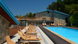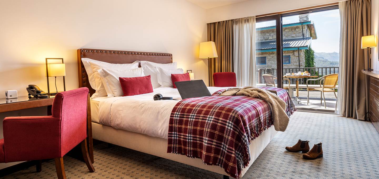 Room with a view of the dam and a double bed and sofa bed. Bathrooms equipped with a bath. Area: 33m². Max Capacity: 4