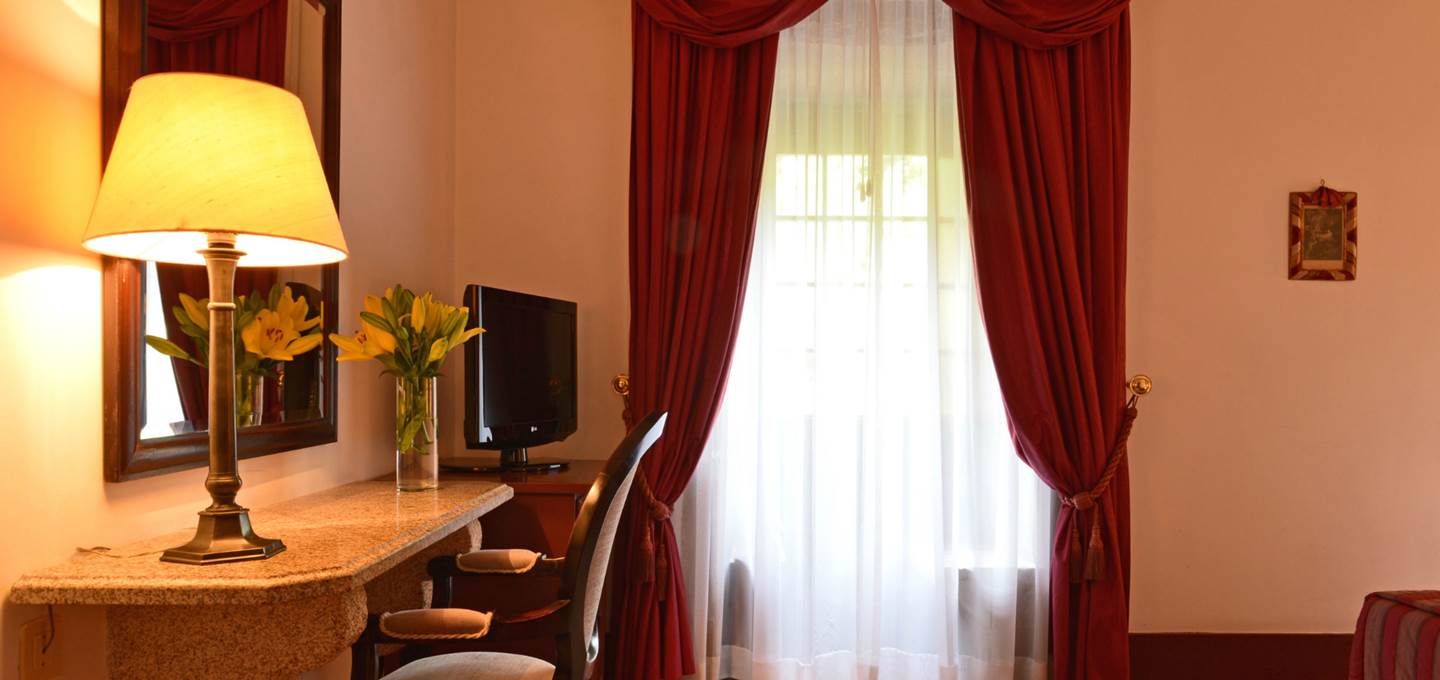 Room with a view over a small garden or mountains, with two single beds. It has a bathroom with a shower. Maximum capacity: 3 adults, or 2 adults + 1 child. Access to the room may have to be done via stairs. Area: 31m²