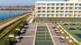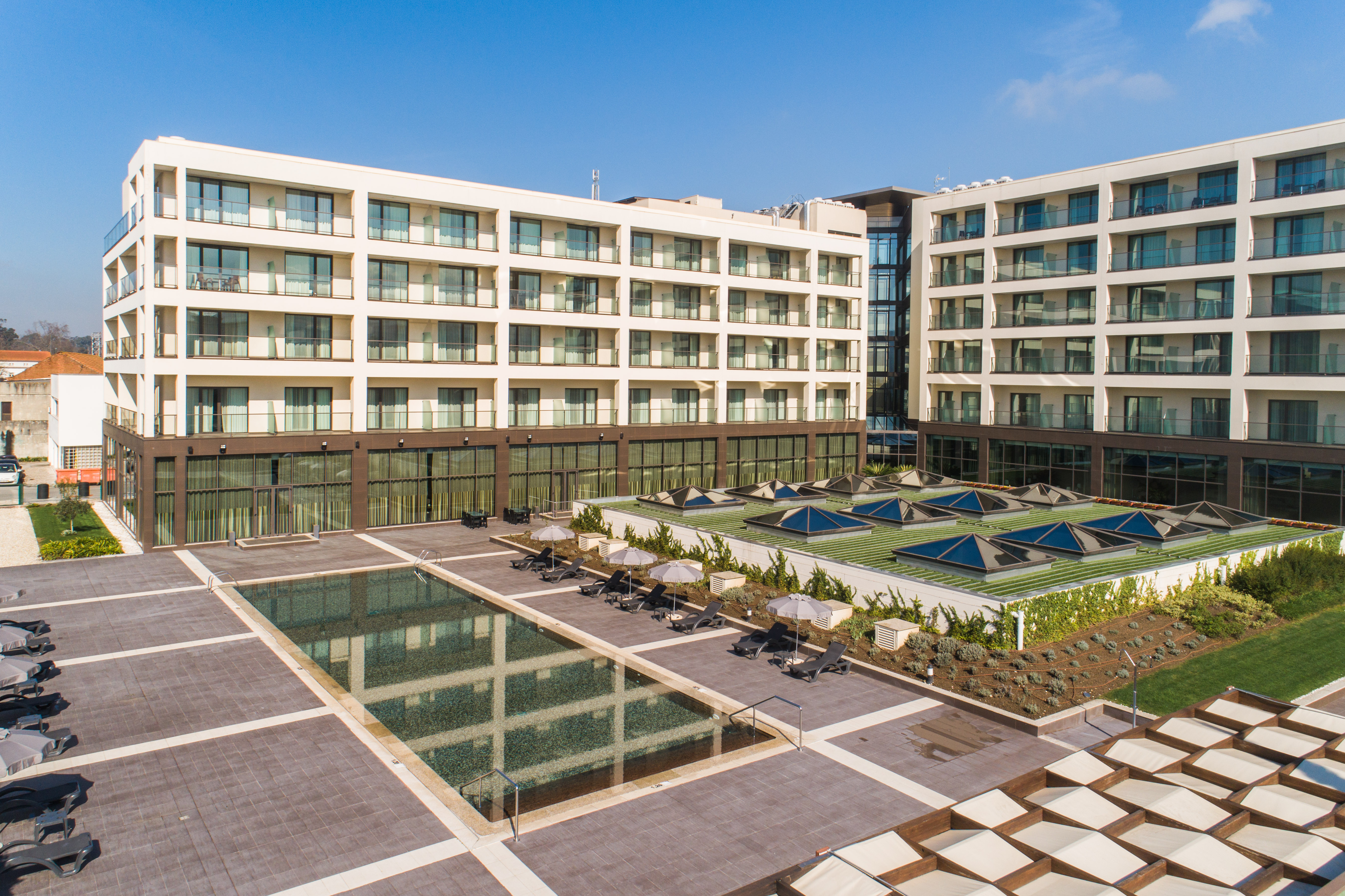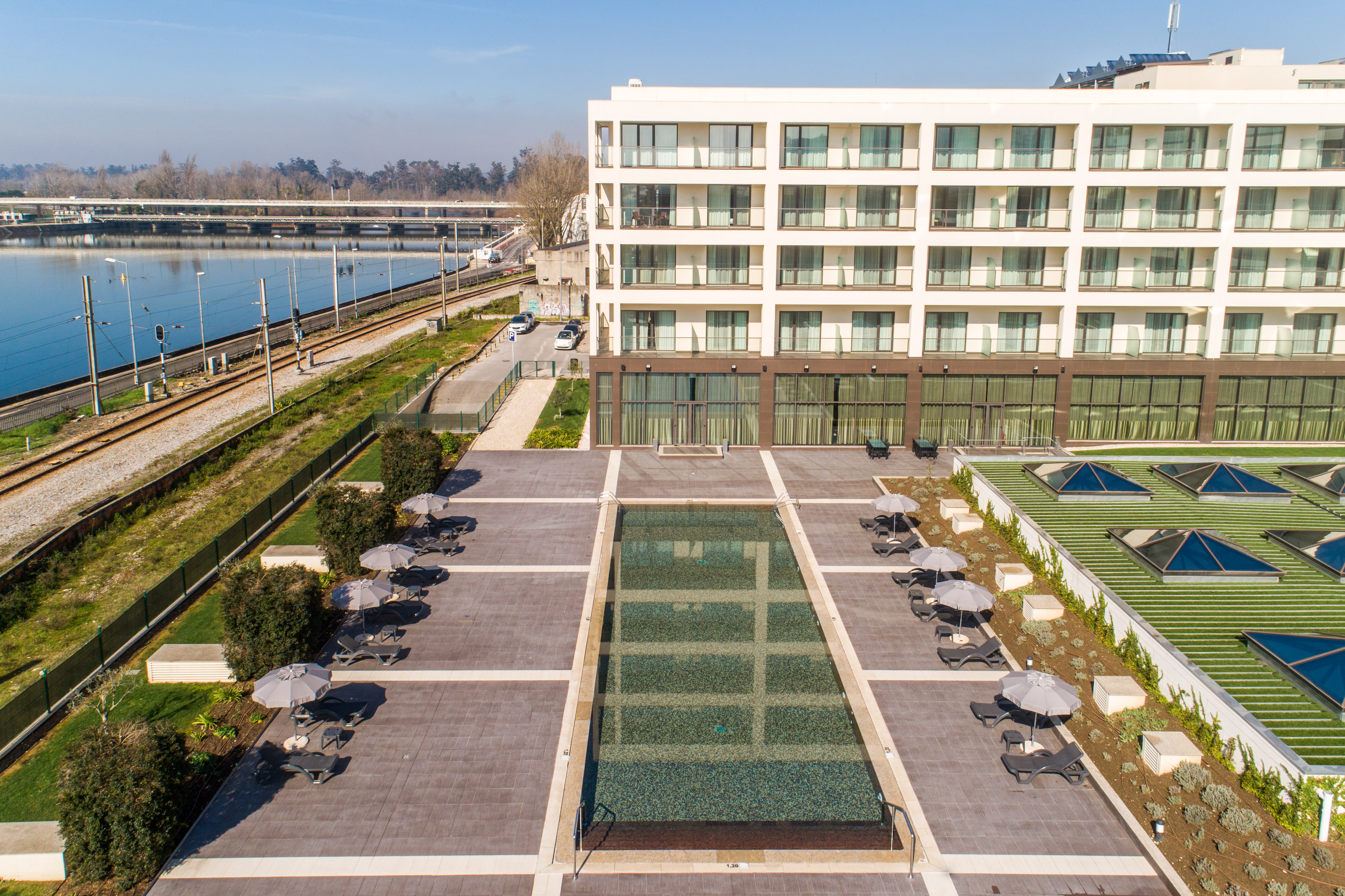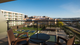 The Vila Galé Coimbra is a modern hotel located in the historic city of Coimbra, just a short 10-15 minute walk to the city centre. The hotel is designed with a modern and minimalist aesthetic, featuring spacious public areas, large windows and plenty of natural light. Rooms are well-appointed, with many offering views of the Mondego River.